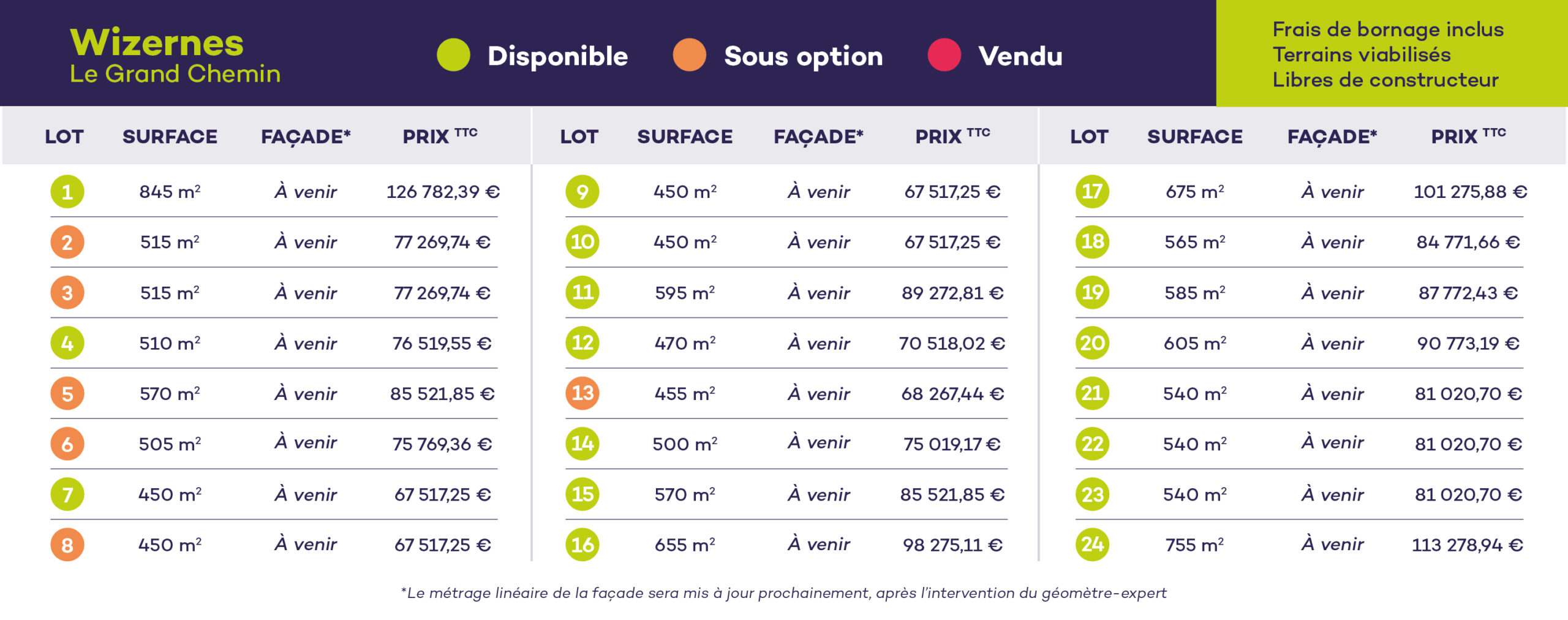 - Les parcelles signées en compromis de vente chez le notaire sont considérées comme vendues et sont retirées de la liste ci-dessus